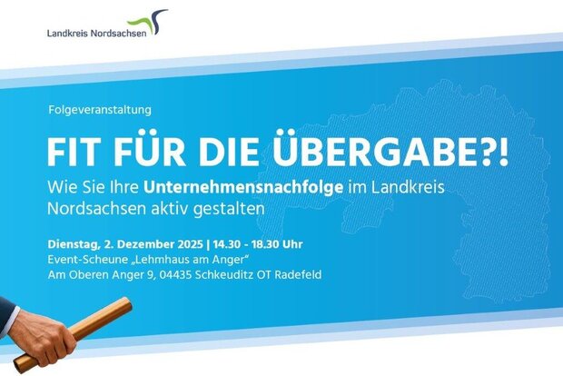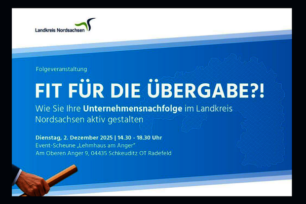 In der ersten Veranstaltung von „Fit für die Übergabe?!“ haben Unternehmerinnen und Unternehmern im Landkreis Nordsachsen Orientierung und praxisnahes Wissen für die Gestaltung ihrer Unternehmensnachfolge gewonnen. In der zweiten Veranstaltung geht es nun darum, dieses Wissen zu vertiefen, konkrete Ansatzpunkte und Ansprechpersonen zu finden und somit tiefer in das Thema Unternehmensnachfolge einzutauchen.Diese Veranstaltung eignet sich insbesondere für die Unternehmen, die bereits an der ersten Veranstaltung teilgenommen haben. Aber auch Unternehmerinnen und Unternehmer, die neu hinzukommen, werden von der Veranstaltung profitieren.